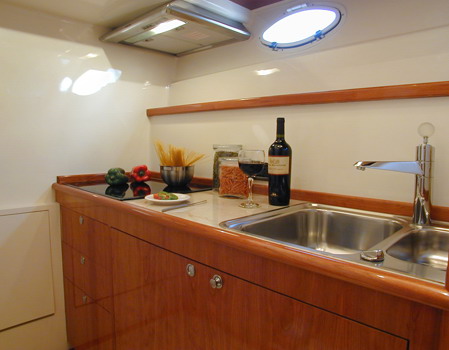 Встроенное оборудование наделяет камбуз значительным количеством рабочего места. Холодильники размещены под контртопом.