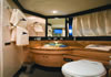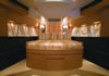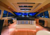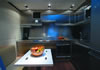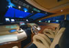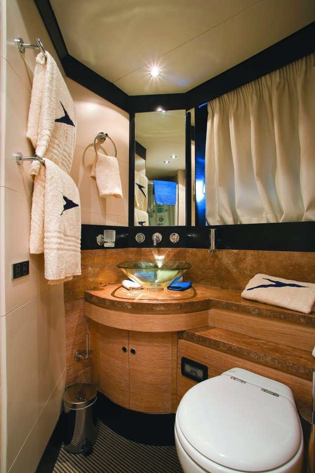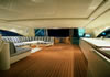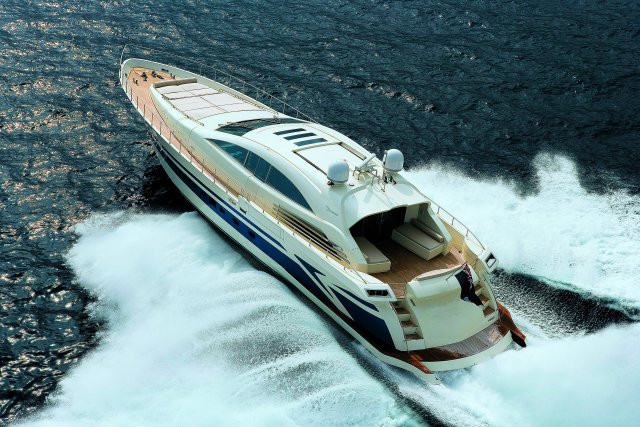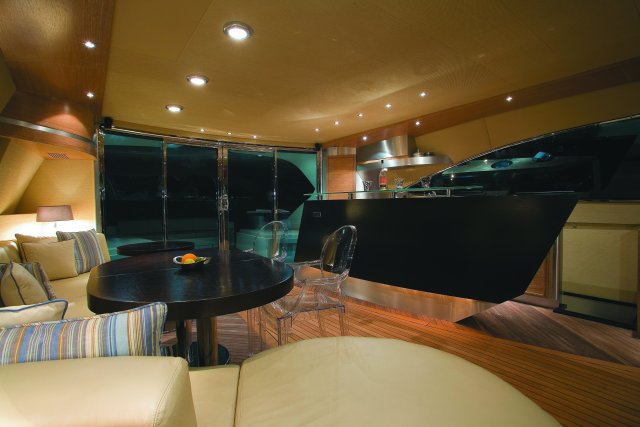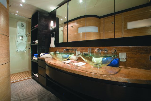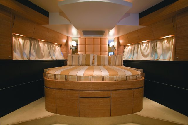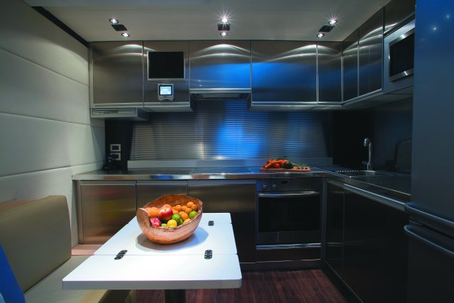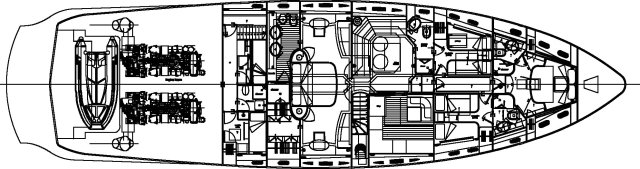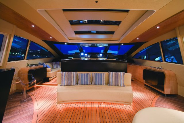 Drive ASD16 Navy (самым большим, который когда либо был произведён). Проект был реализован с учётом параметров, установленных международной коммерческой комиссией по сертификации MCA. Вопросы разработки интерьера и внешних линий в данном проекте курировал архитектор Джанлука Капути . Внешние зоны представляют собой три удобных зоны для загара, два вместительных ангара (один на корме и один на мостике носовой части с раскрытием в форме крыльев чайки), две боковых королевских лестницы и убирающаяся в корму площадка для туалета. Данная система представляет собой энное подтверждение пластичности, которая прослеживается во всём проекте. Широкая кормовая прощадка, разработанная для использования по всей своей ширине в то время как лодка стоит на якоре, посредством выдвижного механизма, позволяет максимально уменьшить гидродинамическую сопротивляемость подвесных кронштейнов во время навигации. Внутренние объёмные решения сочленены на двух мостиках и предусматривают большой салон на основном мостике с зоной для бара и провизионки, диваны с сидячими местами приблизительно для двадцати гостей, а также небольшой служебный туалет. По бокам салон обставлен невысокой мебелью и полками; в центральной его части расположен ещё один диван с видом на корму, который замыкает зону проживания. Элегантная тумба, внутрь которой встроен плазменный телевизор63’’, установленный на сдвижной механизм, идеально разделяет футуристический пост управления, оборудованный тремя электрокреслами для капитана и гостей. Технологический капитанский мостик содержит различные панели управления и контроля, некоторые из которых частично отключены. Слева от капитанского мостика расположена зона-релакс со спальным диваном с регурируемой спинкой, в то время, как по правому борту расположена небольшая лестница для спуска на нижние этажи. В центре судна расположены две боковых двери доступа во внешние ходы сообщения, и как того требует MCA, все пути доступа на нижний мостик герметично закрываются люками, ловко скрытыми за панельными обшивками. Вся средняя площадь судна освещается большой сдвижной электрической крышей, которая позволяет в полной мере насладиться морским путешествием на открытом воздухе. Широкие застекления в 360° и большие стекляные двери на корме способствуют передаче свободного духа судна “open”. На нижнем мостике помещение очень ярко освещается посредством двух витражей на кровле, расположенных стратегическим образом. Компоновка, выбранная судовладельцем, предполагает телевизионный зал, отдельную провизионку для экипажа, 4 двухспальных кабины для судовладельца и гостей и 2 кабины для экипажа, снабжённые отдельными туалетами. Особое внимание было уделено термозвукоизоляции, которой был посвещён отдельный проект, предусматривающий использование смешанных материалов. Также, большое внимание было уделено вместимости груза на борту посредством использования углеродного волокна для задней двери ангара, большой открываемой крыши, и других передвижных частей. Что касается материалов, использованных для интерьера, чередуются teak wenge для котлов, и белёный и декапированный дуб для поверхностей мебели, этажей и перегородок. Использование аксессуаров из полированной и сатинированной стали, а также технологических композитных материалов со
