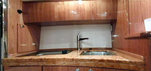 Встроенное оборудование наделяет камбуз значительным количеством рабочего места. Холодильники размещены под контртопом.